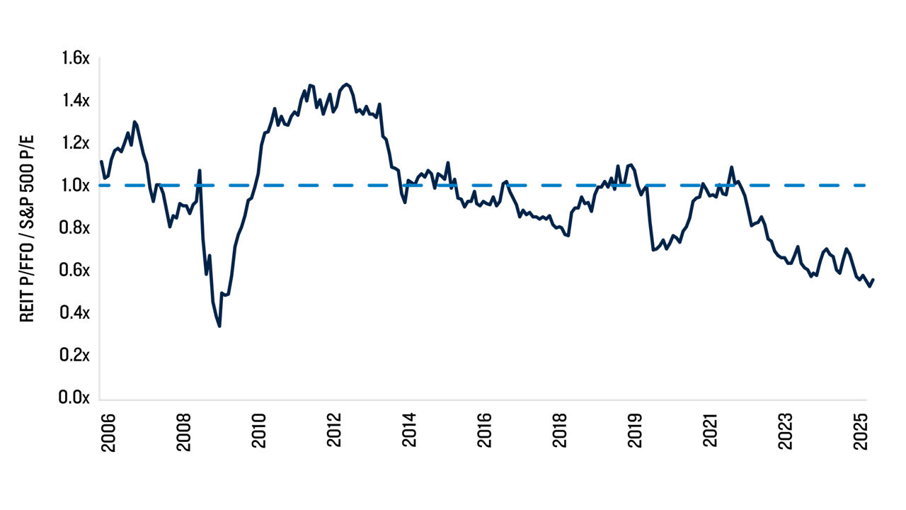 Compelling valuations supporting mean reversion: REITs are trading at historical discounts to equities. As central banks progress through easing cycles, this valuation gap is expected to narrow, a trend that has historically driven significant REIT outperformance. We see opportunities to capitalise on the situation via REITs associated with powerful secular trends and distinct regional dynamics.
