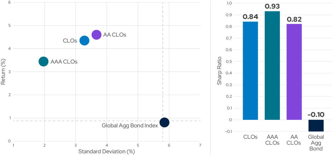 “CLOs’ higher Sharpe ratio indicates efficient compensation for the level of risk, making them an attractive choice for investors,” Wilches explains. Currently higher than investment grade corporate bonds, AAA CLO yields serve as a foundation for compelling risk-adjusted return potential versus traditional fixed income.