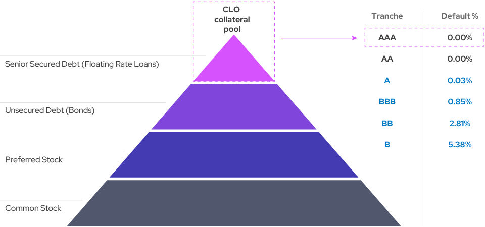 CLOs consist of senior secured corporate loans that are pooled into a special purpose vehicle, which issues securities in tranches offering various levels of risk and return potential. Payments from the underlying loan pool are made to the highest quality tranches first as part of a top-down “waterfall” hierarchy.