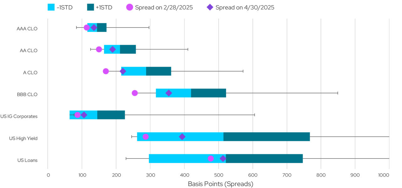 As tariff concerns rippled through markets in April, credit spreads widened and credit curves steepened to varying degrees; however, this was not the case for AAA CLOs. “During stress events, AAA CLOs behaved similarly to high-quality fixed income instruments, offering predictable performance and minimal spread volatility,” Wilches says. “This creates a very robust cushion for the portfolio amid market volatility.”