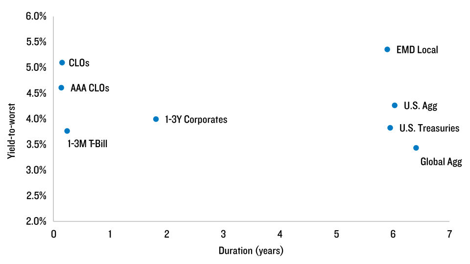 Source: PGIM using data from JP Morgan and Bloomberg as of 30/11/2025. JPM CLOIE Index (CLOs), JPM CLOIE AAA Index (AAA CLOs), JPM GBI-EM Global Diversified Index (EMD Local), Bloomberg U.S. Aggregate Bond Index (U.S. Agg), Bloomberg U.S. Treasury Index (U.S. Treasury), Bloomberg Global Aggregate Bond Index (Global Agg), Bloomberg 1-3 Year Corporate Index (1-3Y Corporates), Bloomberg U.S. Treasury Bills: 1-3 Month Index (1-3M T-Bills).