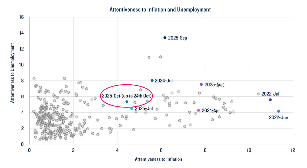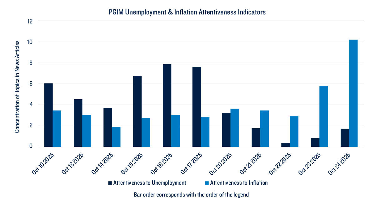 In a recent piece about the data void created by the federal government shutdown, we introduced our “attentiveness” indicators, which measure the media’s focus on inflation and unemployment. Let’s look at them again to see if attention is tilting toward inflation unemployment. This can tell us something about which side of the dual mandate the Fed may be weighing more heavily.